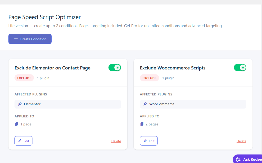Load plugins conditionally by pages, categories, and tags with unlimited conditions to reduce plugin bloat and improve Core Web Vitals